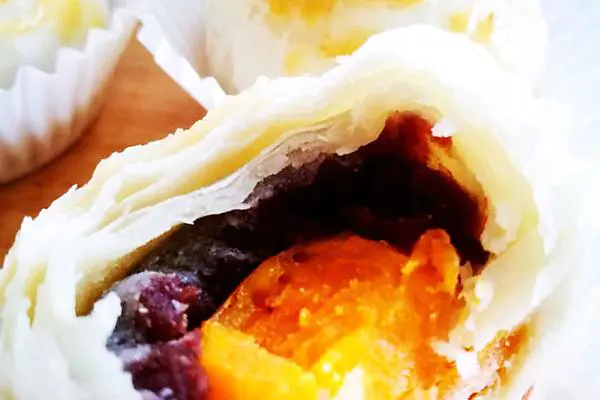 雨天凉快,开酥正合适,酥香可口的蛋黄酥出炉啦,迫不及待地咬一口,好香[色]