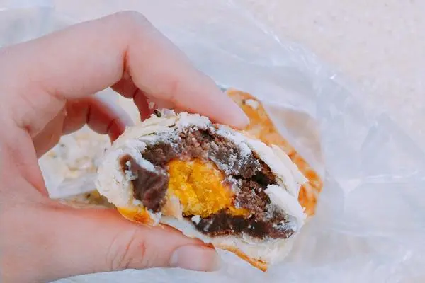刚出锅的 剩下的面团不够红豆馅,就用蛋黄加肉松做成了饼 放了一夜的,皮很酥 掉渣...