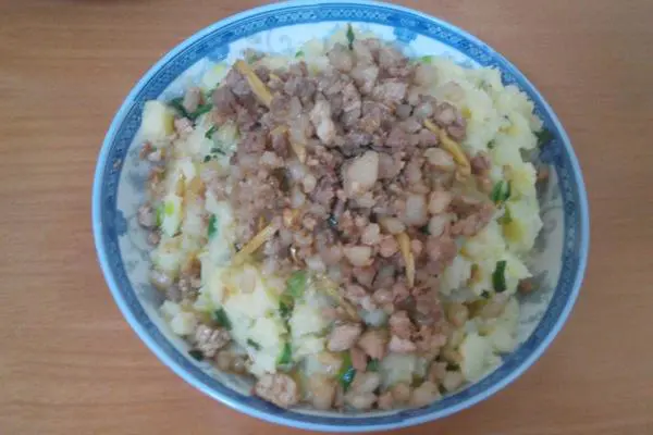 中午吃大米小米粥红烧鸡翅土豆泥鸡蛋肉饼(刚蒸好儿子就叫着要吃,吃了一部分)小青菜