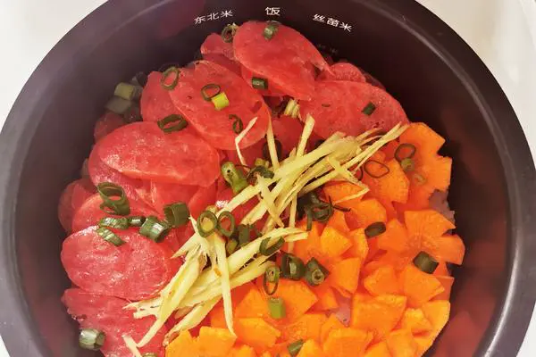7、焖米饭。提前十分钟放入腊肠、胡萝卜、姜丝、小葱。继续焖制。