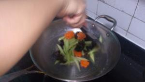 锅内放入橄榄油,烧至5成热,倒入西芹,木耳和红萝卜翻炒
