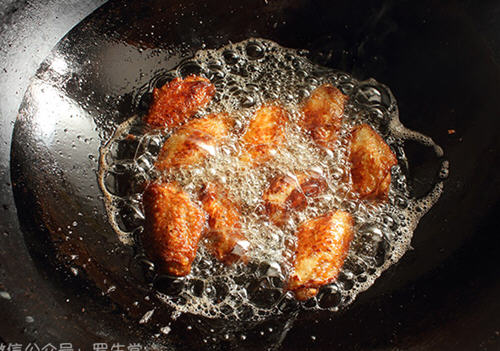 5、炒锅放油,烧至五成热下鸡翅半煎半炸,油量比炸要少,比煎炒要稍微多一些,可以没过鸡翅的一半左右就行了,煎至两面焦黄捞出。