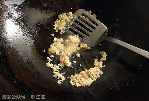6、油倒出留底油,中大火煸炒蒜茸至发黄变干一些。