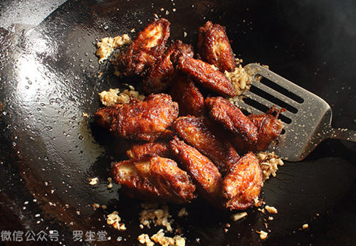 7、放入鸡翅中火炒半分钟左右,至发出焦香蒜气便可出锅了。