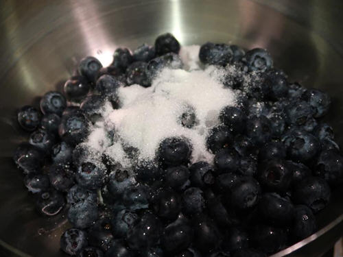 1、将蓝莓加入少许细砂糖,煮至小滚备用。