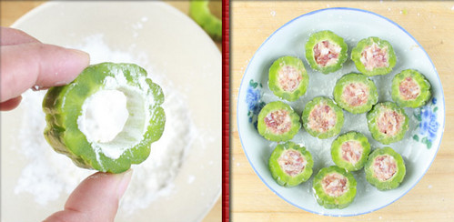 3、酿肉馅前一定记得在凉瓜的内环儿上抹淀粉,不然在煎的过程中或者是烧的过程中肉馅会掉出来。