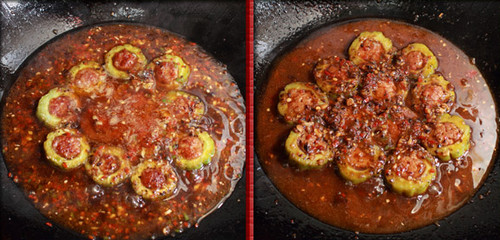 9、把煎好的凉瓜放进去中火烧两分钟,然后逐个翻过来再烧两分钟即可,把凉瓜盛出来放在铁板上,然后把锅里的汁勾芡浇上去,撒葱花就行了。
