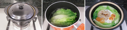煲饭时按比例加入水量,最直观就是用自己的手掌量度,就是水面高出大米一掌厚左右就可以了,切记不用大火一直烹调,前面2分钟大火,后面一直中小火煲,火候大了砂锅中的米浆溢出导致火源熄灭、还容易糊底,米饭夹生。摆放肉饼和咸蛋不要重叠,这样米饭中的水蒸气才能均匀渗透食材中,熟的快。蔬菜随意搭配了。
