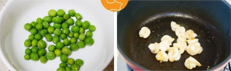6.最后放入虾仁和豌豆,开火,迅速炒匀,关火,盛盘。