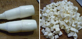 1、将茭白剥壳清洗一下,放在案板上切成丁,待用。
