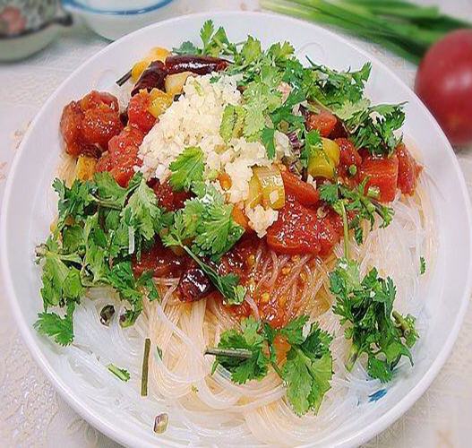 番茄温拌粉丝主要取材于番茄和粉丝,是一道非常且美味十足的美食,它的维生素含量也非常高,经常食用对人体健康有着很大的作用哦,还可以增强人的食欲呢,对提高人体免疫力、增强人体抵抗力,也有着不可或缺的作用,不想吃饭的时候,来上这么一道美食,当做主食也是很不错的呢。