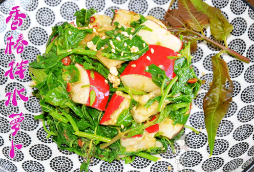 今年的香椿的价格格外的高,尤其是本地的香椿没有上市之前,买了一小撮,顶多也就二两左右要8块钱,真是坑人啊,可是为了美味,也顾不得价位了,这树上的蔬菜,也算是卖出了天价了,不过刚出芽的香椿,吃起来真叫一个香啊,美味极了,和水萝卜一起凉拌,吃起来脆爽的水萝卜也带有浓郁的香椿味。