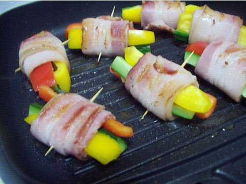 2.取博客爱丁堡培根1片平放,然后将处理好的3色蔬菜摆上, 然后顺势卷起,再用牙签固定住。