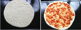 6、开始200度预热烤箱。涂上自制披萨酱,或者番茄酱。