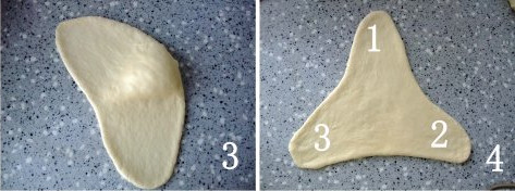 4、取一个面团,从下部开始向下擀开(图2)。接着向左上角擀开(图3)。最后向右上角擀开,使面团有均匀的三个角(图4)。中间部分放葡萄干(图5)。