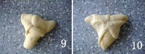 5、拉起第一个角(图6)。再拉起第二个角,向内折,使其压在第一个脚上面,收口向下压在面团下(图7)。拉起第三个角,内折使其压在第二个角上面(图8)。最后将第一个角内折,压在第三个角上,包紧(图9)。整理面团,注意将角的尾端向下向后捏紧压在面团下面(图10)