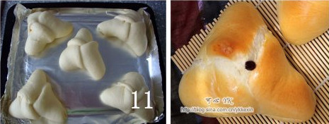 6、把整形好的面团放在铺有锡纸的烤盘上(图11)。烤箱里放碗热水,进行最后发酵。大约发酵30分钟左右。