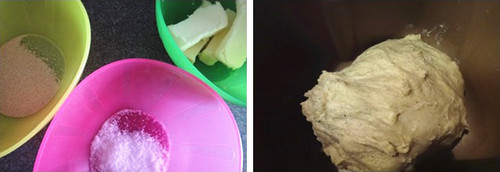 2、其他材料放入面包机和面程序10分钟(均匀成团即可)。
