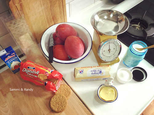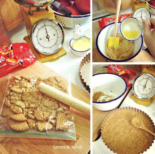 1、将消化饼敲碎 (我用密封袋先装袋后再敲碎,如果有食物调理机可打碎也可用) 与融化的奶油拌匀,倒入模底均匀的压实,在放进冰箱至少30分钟。