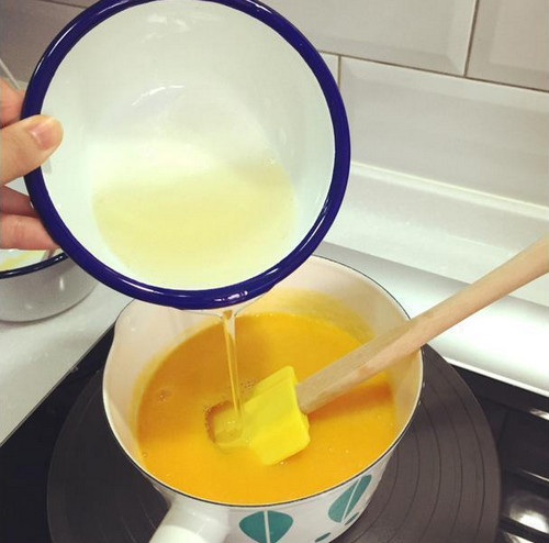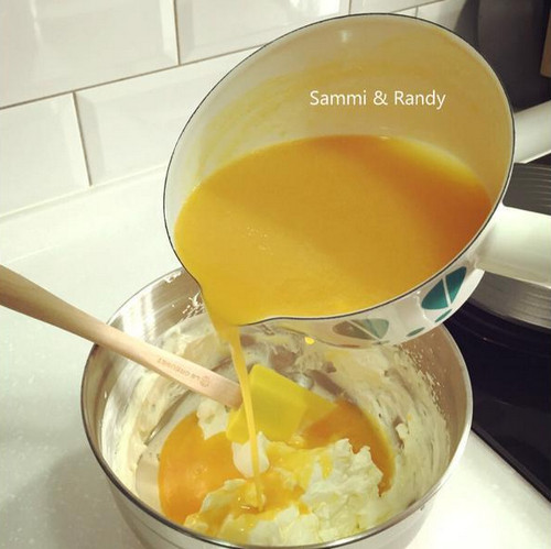 5、把放凉的芒果果泥慢慢加入打好的鲜奶油中,搅拌均匀就成芒果慕斯了。