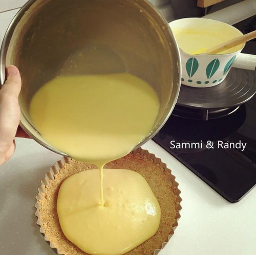 6、再将冷藏30分钟的派皮取出,倒入芒果慕斯,把派盆稍微敲一下,让里面的空气跑出,就可以在放入冰箱冷藏至少3小时至凝固。