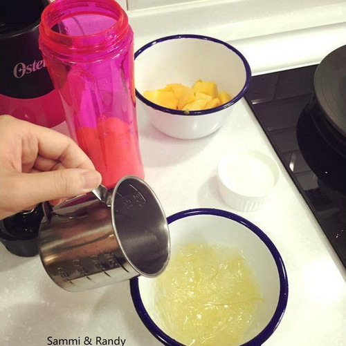 2、取300g 的芒果果肉放入果汁机中,加2汤匙开水一并打成果泥备用。(请先预留3汤匙的量作镜面步骤使用) 注意,同时间,先准备一碗冰水泡入 (b) 吉利丁片 8片,先行泡软。