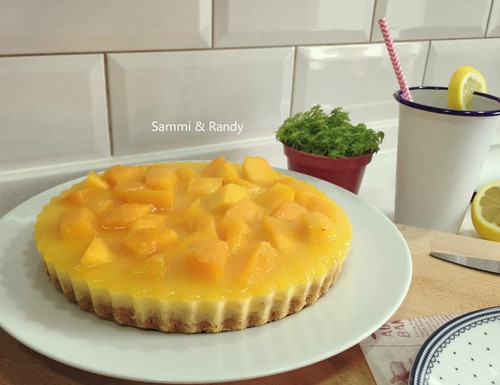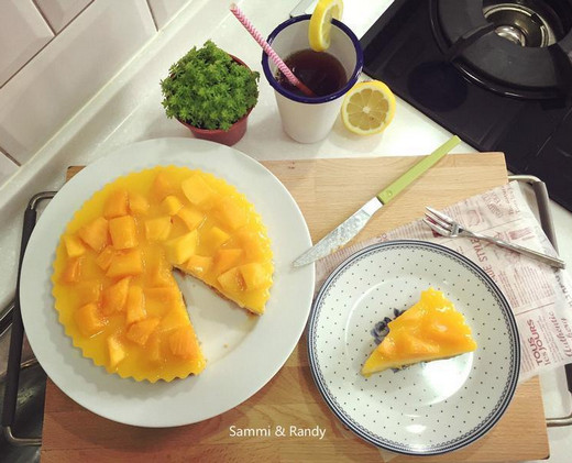 8、取出慕斯确认是否已凝固。在上层放上一些切小块的芒果果肉做装饰。 ( 芒果果肉放上前,请先用餐巾纸吸干水分) 再均匀淋上刚做好的镜面酱汁,放入冰箱冷藏至少3小时凝固或过夜也可。