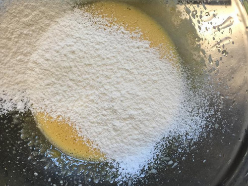 2、低进面粉过筛加入(1),轻轻拌匀。