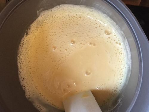 9、然后倒回锅子中,边煮边搅拌至稠状,盖上保鲜膜放凉备用。