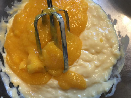 13、芒果泥加入卡士达酱中,搅拌均匀。