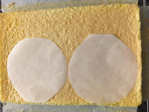 15、将海绵蛋糕切成两个圆,和一个长条状。