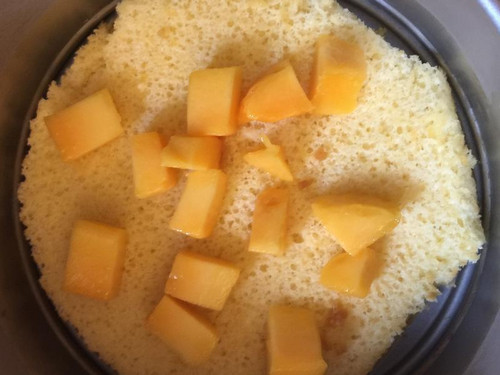 16、依海绵蛋糕、芒果丁、芒果慕斯、海绵蛋糕、芒果丁、芒果慕斯的顺序堆叠,(长条状的海绵蛋糕围绕烤模),放冰箱四小时以上,即可食用。