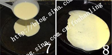 四:最上面一张覆盖用的大饼皮要做到又薄又嫩利于包裹,如太厚太干的话容易开裂,所以煎时一定不能翻面(除非你特别喜欢焦色),面糊摊平后马上离火,让锅的余温将其闷熟,成熟后马上盛出否则会越老断裂。