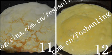 9、面糊摊成薄薄的一圆片,很快便凝固,并鼓起不少气泡,图10.