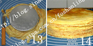 12、晾凉的瓶皮叠起来,扣上6寸圆形蛋糕模具底片,裁出多余的饼皮,图13.