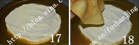 16、取一张小号饼皮摊平在蛋糕垫上,涂抹一层薄薄的奶油,图17.