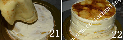 22、重复这个过程,一直叠到自己喜欢的高度,用抹刀将四周多余的奶油去掉,图22。