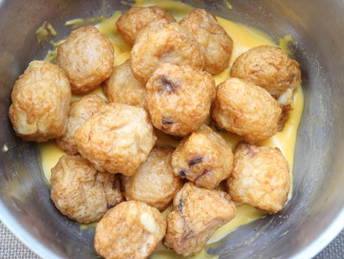 4、将酥炸海鲜丸丢进去,快速搅拌,让每颗海鲜丸都能沾附起司酱。