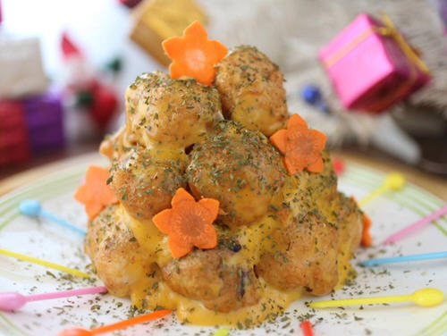 派对就是要欢乐!分享美食更是营造气氛的一种方式!将酥炸海鲜丸裹附起司酱,再堆叠成圣诞树形状,花点巧思稍加装饰,相当应景。再准备小叉子,让客人自由享用,派对气氛也更加欢乐。