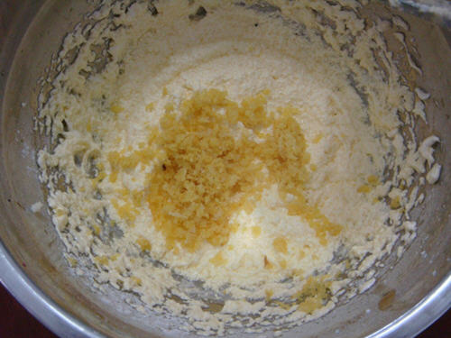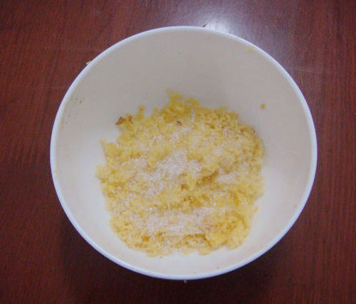 1、柠檬用盐搓洗干净,皮擦成柠檬皮屑(不要擦到白色部分,会比较苦),加入5克糖,腌制15分钟。柠檬榨汁备用。