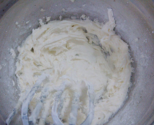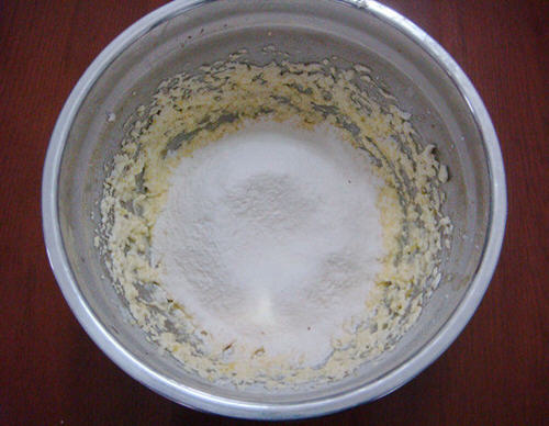 2、糖粉和盐加入到黄油中,打发至黄油发白。