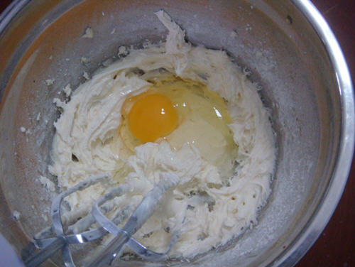 3、鸡蛋加入到黄油中打发,最好每次放,每次都要混合均匀再放蛋液,不会产生油水分离。