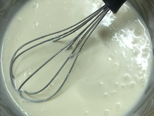5、将吉利丁牛奶以及优格分次加入乳酪糊中搅拌均匀至光滑。