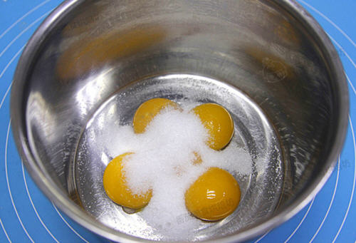 1、蛋清蛋黄分离;蛋黄加25g细砂糖。