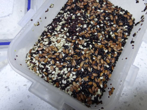 面团材料B:亚麻籽9g,白芝麻9g,黑芝麻9g,罂粟籽9g,小米9g,水45g