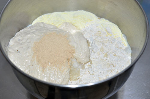3、 发好的液种与面团材料中除黄油,车打蔓越莓干外的材料一起放入厨师机搅拌桶中。