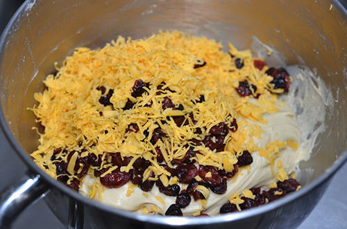 6、 加入刨成丝的车打奶酪和蔓越莓干。