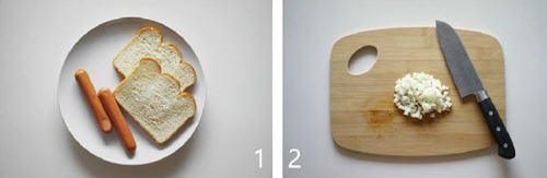 1. 烤箱预热350度,准备好吐司和热狗肠。