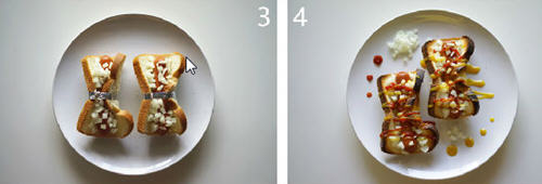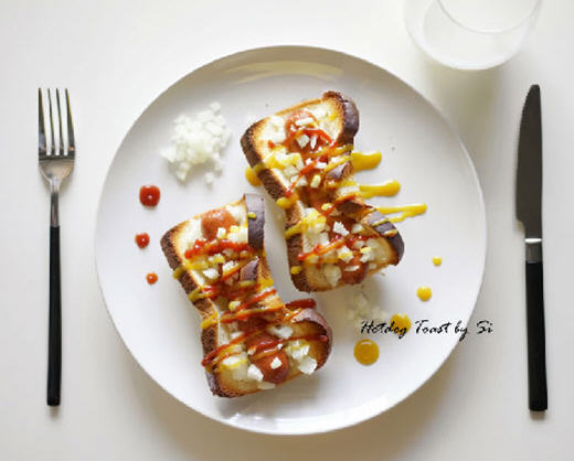 吐司和热狗肠混合做一款美味小吃,只要稍稍整形一下即漂亮又上档次,用茄酱调味就能开吃了。