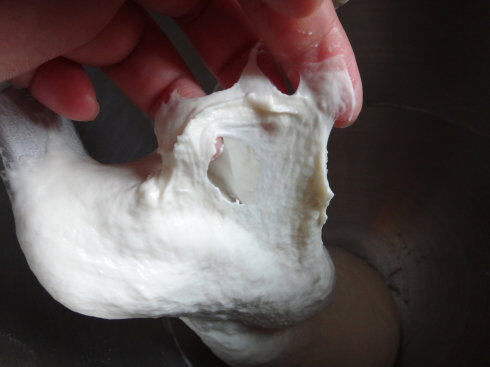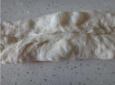 1、面团材料放入厨师机搅拌桶,和面至面筋形成,破洞边缘呈现撕裂的锯齿形,面团最终温度控制在23度左右